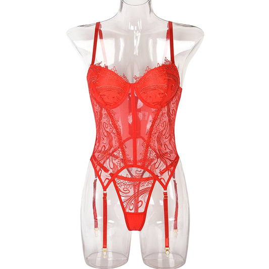 Ellolace Delicate Lingerie Floral Fairy Fancy Beautiful Underwear 4-Piece Lace Exotic Sets Chain Garters Seamless Sensual Outfit