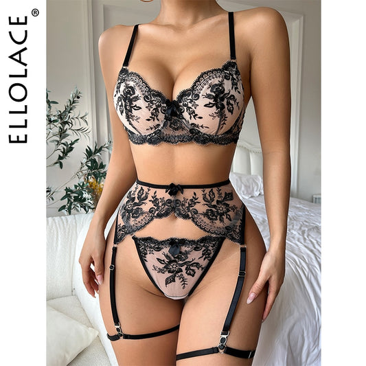 Ellolace Delicate Lingerie Fancy Lace Underwear 3-Piece Transparent Bra And Panty Set Uncensored Garter Luxury Intimate
