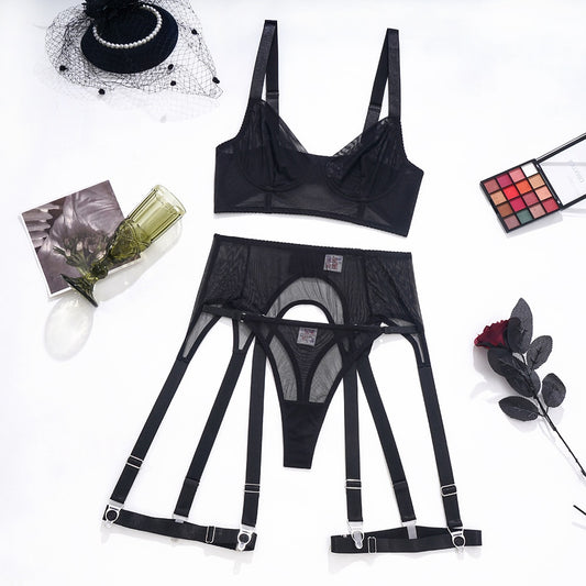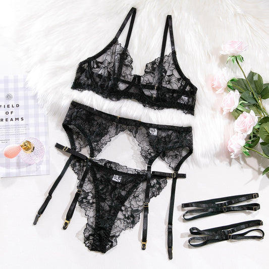 Ellolace Underwear Sexy Lingerie 3-Pieces Transparent Bra Lace Suit Sexy Garter Belt With Stockings Woman Erotic Intimate