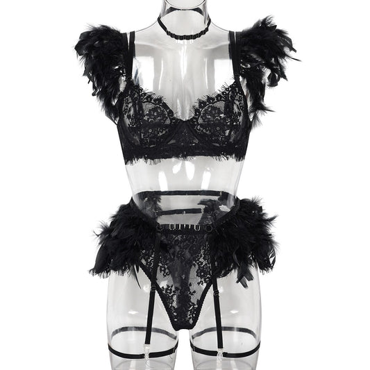 Ellolace Feather Lingerie Lace Luxury Underwear 5-Piece See Through Sissy Seamless Intimate Push Up Sensual Bra And Panty Sets