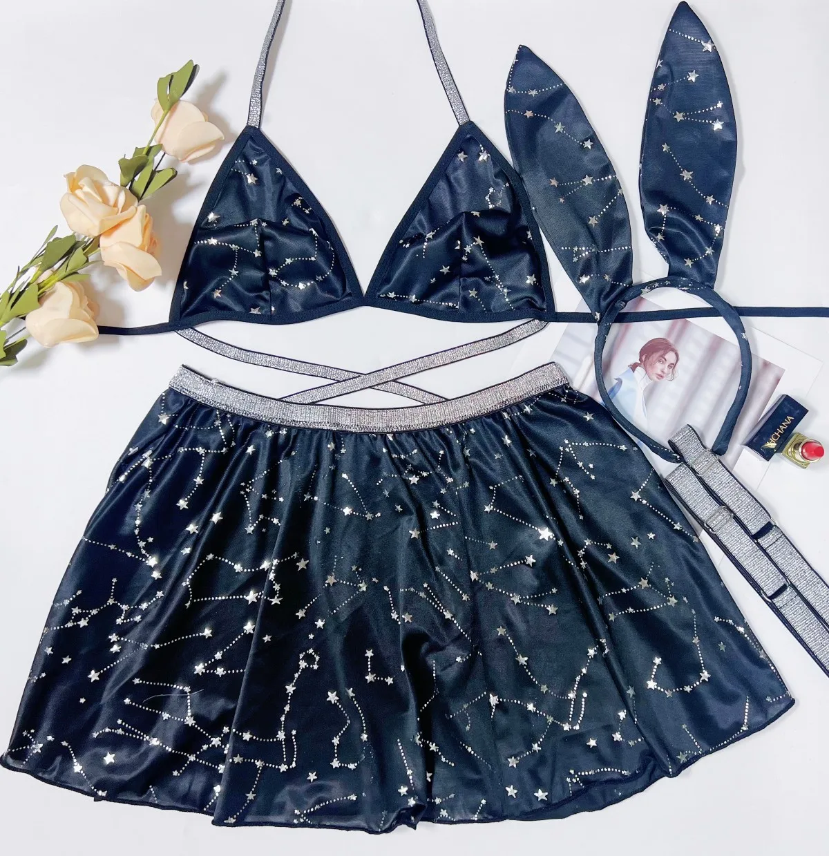 Ellolace Bunny Lingerie Fantasy Starry Sky Ruffled Skirts Lace Up Black Intimate Goods Sensual Fairy Sexy Intimate 3-Piece